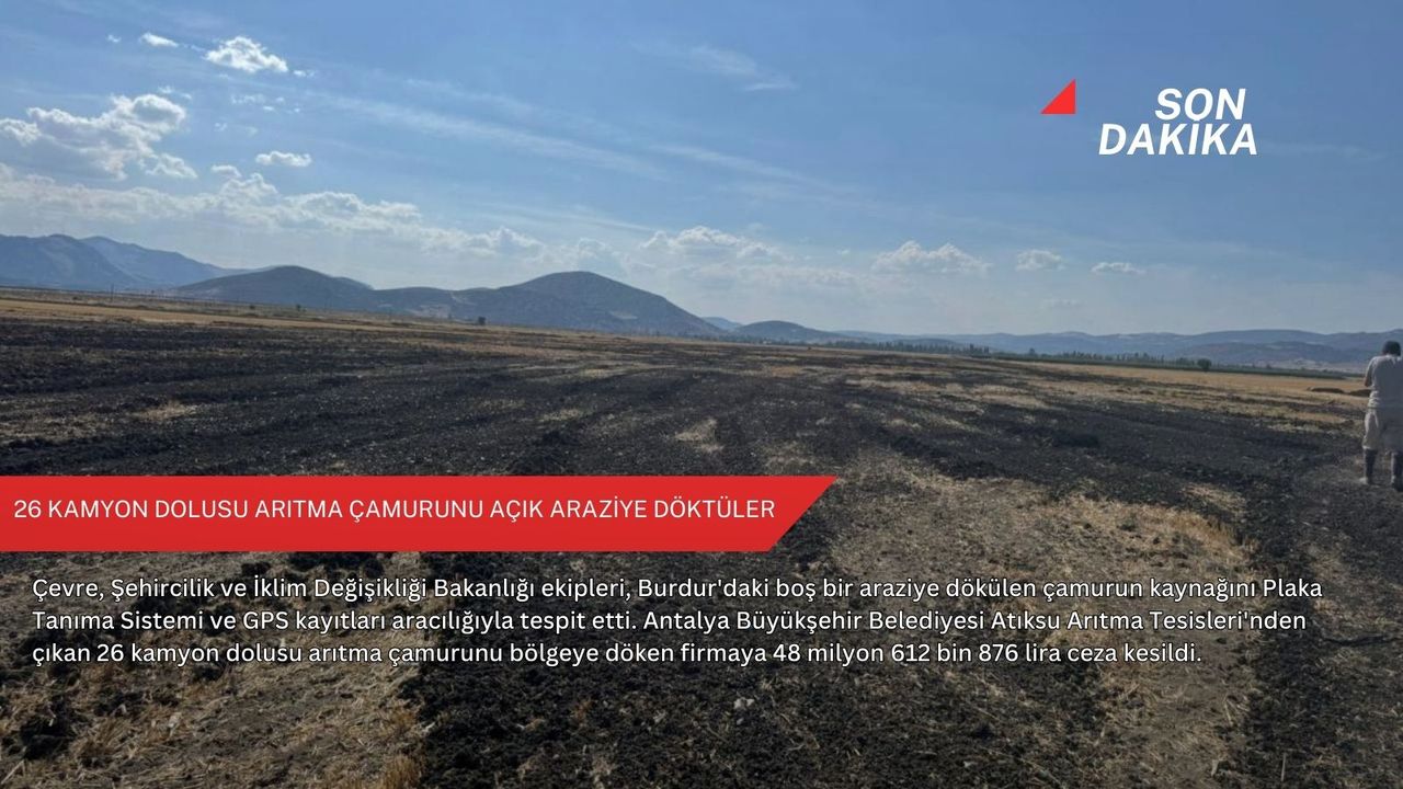 Atık su arıtma tesislerinde oluşan arıtma çamurlarını Bakanlık tarafından “Çevre İzin ve Lisans Belgesi” verilen geri kazanım ve bertaraf tesislerine götürmek yerine Burdur’daki boş araziye döken firmaya “2872 sayılı Çevre Kanunu” kapsamında 48 milyon 612 bin 876 TL idari ceza uygulandı. Firmanın izin lisansı iptal edildi ve faaliyeti durduruldu. Ayrıca Cumhuriyet Başsavcılığı’na suç duyurusunda bulunuldu. İnceleme kapsamında arıtma tesislerinden alınan numunelerin referans değerlere uygun olup olmadığına yönelik analizler de sürüyor.