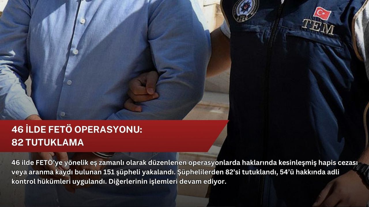46 ilde FETÖ’ye yönelik eş zamanlı olarak düzenlenen operasyonlarda haklarında kesinleşmiş hapis cezası veya aranma kaydı bulunan 151 şüpheli yakalandı. Şüphelilerden 82’si tutuklandı, 54’ü hakkında adli kontrol hükümleri uygulandı. Diğerlerinin işlemleri devam ediyor.