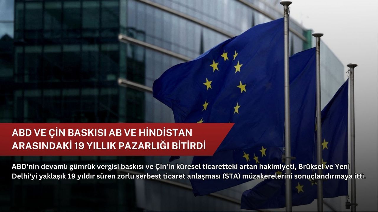 19 yıldır süren müzakerelerin sonuçlanmasında, ABD'nin Hindistan'a yönelik gümrük vergisi tehditleri ile Pekin'in tedarik zincirindeki baskın rolünün belirleyici olduğu ifade edildi.