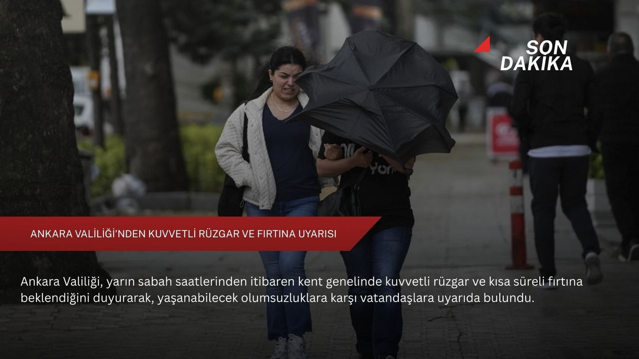 Valilikten yapılan açıklamada, Meteoroloji Genel Müdürlüğü Analiz ve Tahmin Merkezinden alınan son verilere göre, yarın sabah saatlerinden itibaren Ankara il genelinde rüzgarın güney ve güneybatı yönlerden kuvvetli rüzgar ve kısa süreli fırtına (40-60 km/saat, yüksekler başta olmak üzere yer yer 70 km/saat) şeklinde eseceğinin tahmin edildiği belirtildi.