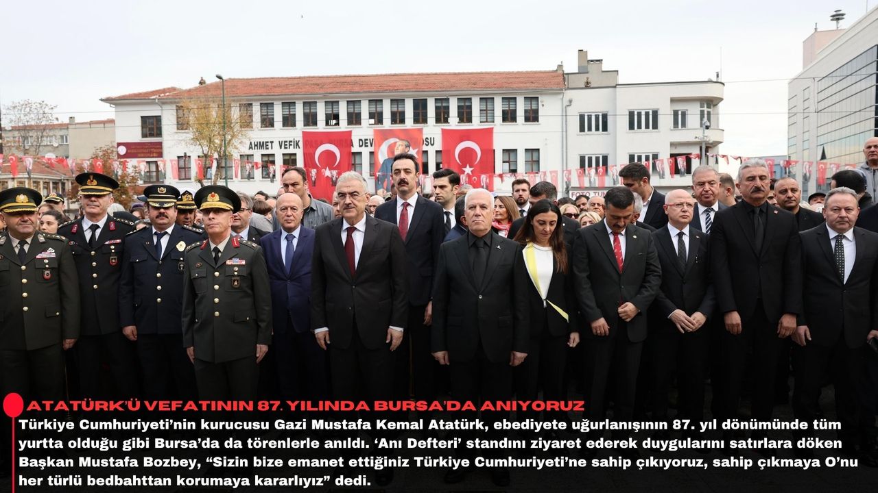 “Bugün seni sonsuzluğa uğurladığımızın 87. yılı. Seni özlemle anıyorum. Sizin bize emanet ettiğiniz Türkiye Cumhuriyeti’ne sahip çıkıyoruz, sahip çıkmaya O’nu her türlü bedbahttan korumaya kararlıyız. Sizin önderliğinizde kazandığımız bağımsızlık ruhu ve Cumhuriyetimizin aydınlık ilkeleri sayesinde; sanayisi, tarımı, kültürü ve üretim gücüyle ülkemizin lokomotif kentlerinden biri haline gelen Bursa, bugün burada ‘Emanetine sahip çıkan bir Bursa’ olarak kentimizi ve ülkemizi ‘çağdaş medeniyet seviyesine’ yükseltmek için var gücümüzle çalışıyoruz. Bursa olarak ‘En büyük eserim’ dediğiniz Cumhuriyetimize sahip çıkacağız. Cumhuriyetimizin ilelebet yaşaması için var gücümüzle çalışacağız. Seni özlemle, minnetle anıyorum”.