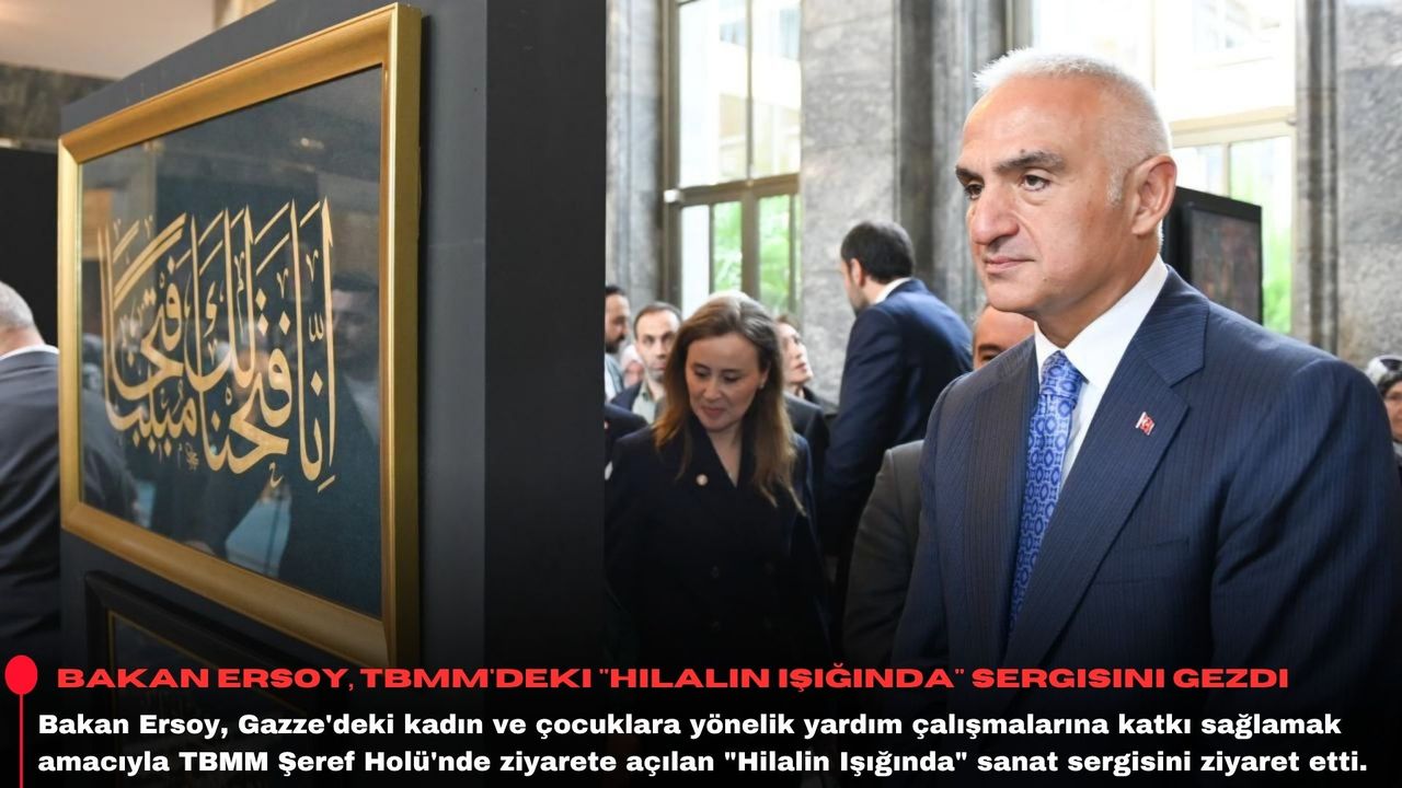 TBMM Başkanı Numan Kurtulmuş'un himayelerinde, Türk Kızılay işbirliğiyle hazırlanan sergideki eserleri tek tek inceleyen Kültür ve Turizm Bakanı Mehmet Nuri Ersoy, sanatçılardan eserlere ilişkin bilgi aldı.