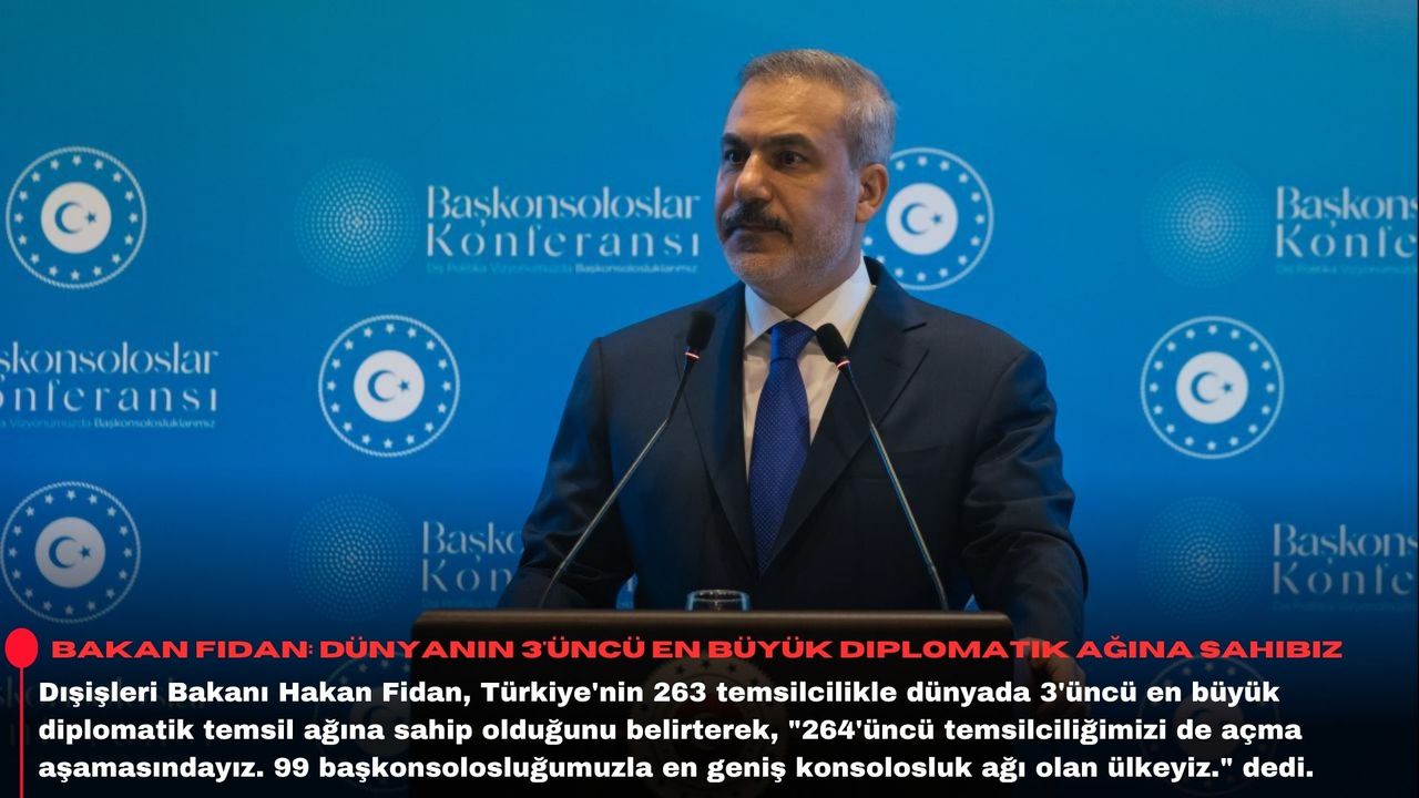 Yurt dışı teşkilatlarının giderek büyüdüğünün altını çizen Fidan, "263 temsilciliğimizle dünyada 3'üncü en büyük diplomatik temsil ağına sahibiz. 264'üncü temsilciliğimizi de açma aşamasındayız. 99 başkonsolosluğumuzla en geniş konsolosluk ağı olan ülkeyiz. 2000'e yakın personelimizle yurt dışında yaşayan vatandaşlarımıza kuvvetli bir kadroyla hizmet vermekteyiz." ifadelerini kullandı.