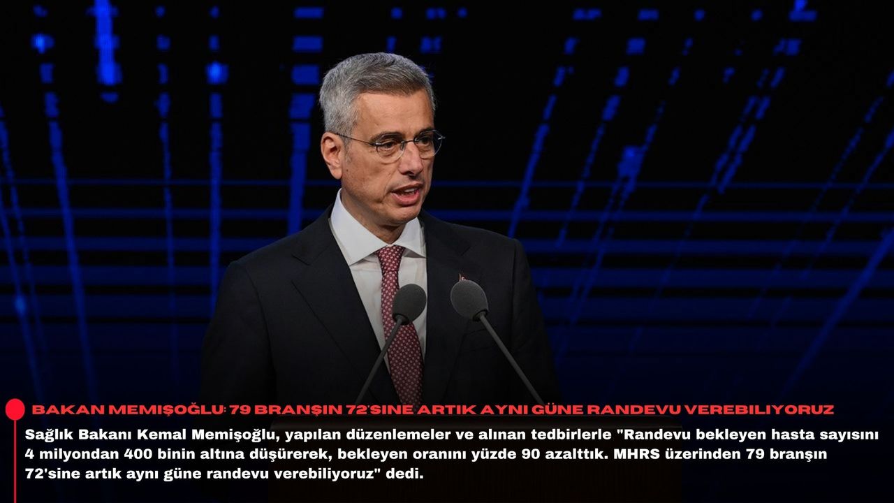Son bir buçuk yılda birinci basamaktaki yatırımlarını hızlandırdıklarını ve dijital dönüşümü ileri bir seviyeye taşıdıklarını vurgulayan Memişoğlu, "Böylece vatandaşlarımızı daha hızlı, güvenli ve nitelikli birinci basamak sağlık hizmetine ulaşabilir duruma getirdik. Yaptığımız düzenleme ve aldığımız tedbirlerle, randevu bekleyen hasta sayısını 4 milyondan 400 binin altına düşürerek, bekleyen oranını yüzde 90 azalttık. MHRS üzerinden 79 branşın 72'sine artık aynı güne randevu verebiliyoruz" dedi.