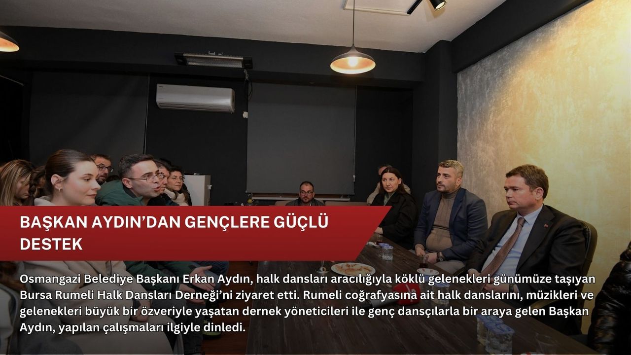 Gençlere yönelik projeleriyle dikkat çeken Osmangazi Belediye Başkanı Erkan Aydın, Bursa Rumeli Halk Dansları Derneği’ni ziyaret ederek yürütülen faaliyetler hakkında bilgiler edindi. Samimi bir atmosferde gerçekleşen buluşmada Başkan Aydın’a Bursa Rumeli Halk Dansları Derneği Başkanı Davut Şen, Osmangazi Belediyesi Meclis Üyesi Kemal Güzelvardar ile dernek ekibi eşlik etti.