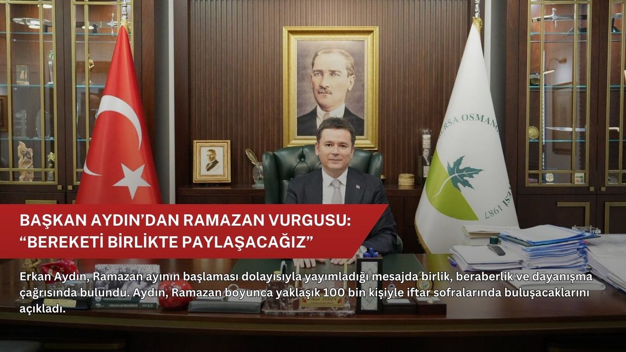 Osmangazi Belediyesi, Ramazan ayı boyunca sosyal dayanışma ve paylaşma kültürünü güçlendirecek etkinliklere imza atmaya hazırlanıyor. Osmangazi Belediye Başkanı Erkan Aydın, 11 ayın sultanı Ramazan’ın başlaması dolayısıyla yayımladığı mesajda, bu mübarek ayın manevi atmosferinin toplumsal birlikteliği pekiştirmesini temenni etti.