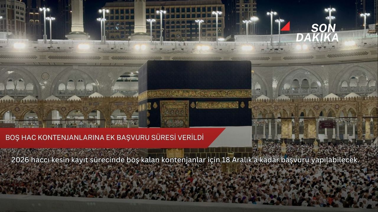 Diyanet İşleri Başkanlığı Hac ve Umre Hizmetleri Genel Müdürlüğünün internet sayfasında yer alan bilgiye göre, noter huzurunda gerçekleştirilen hac kurası sonucunda kesin kayıt hakkı elde eden hacı adaylarından boş kalan kontenjanlar için 11-18 Aralık arasında ek kayıt süresi tanındı.