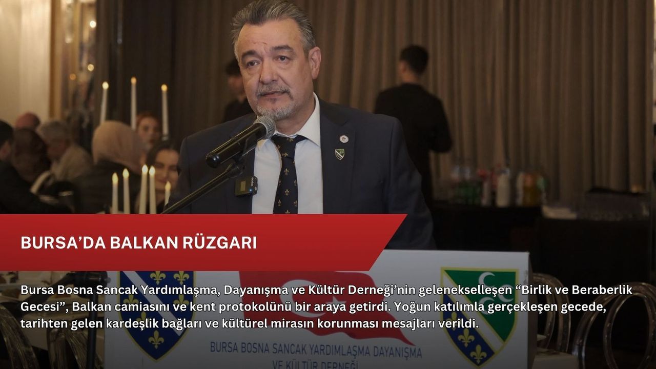 Bursa Bosna Sancak Yardımlaşma, Dayanışma ve Kültür Derneği tarafından düzenlenen ve artık geleneksel bir marka haline gelen “Birlik ve Beraberlik Gecesi”, kültürel zenginlikleri ve güçlü dayanışma ruhunu bir kez daha gözler önüne serdi. Bursa Bosna Sancak Derneği Yönetim Kurulu Başkanı Sadık Şengül’ün ev sahipliğinde düzenlenen geceye; Sırbistan Sancak Milletvekili ve TBMM Parlamentolararası Dostluk Grubu Başkanı Muammer Baçevac, Sırbistan Boşnak Milli Meclisi Başkanı Fuad Bacıca, AK Parti Bursa Milletvekili ve TBMM Bosna Hersek Dostluk Grubu Başkanı Refik Özen, AK Parti Bursa Milletvekili ve TBMM Sırbistan Dostluk Grubu Başkanı Ayhan Salman, AK Parti Bursa Milletvekili Ahmet Kılıç, CHP Bursa Milletvekili Hasan Öztürk, Bursa Büyükşehir Belediyesi Başkan Vekili Mehmet Aydın Saldız, Yıldırım Belediye Başkanı Oktay Yılmaz, Türkiye Bosna Hersek Kültür Dernekleri Federasyonu Başkanı Barbaros Taşer, konsoloslar, siyasi parti temsilcileri ve çok sayıda sivil toplum kuruluşu başkanı katılım sağladı.