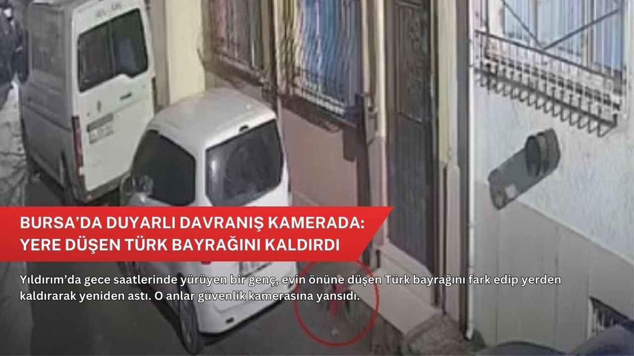 Bursa’nın Yıldırım ilçesinde yaşanan duyarlı davranış takdir topladı. Gece saatlerinde sokakta yürüyen bir genç, bir evin önüne düşen Türk bayrağını fark edince yolunu değiştirerek bayrağı yerden aldı.