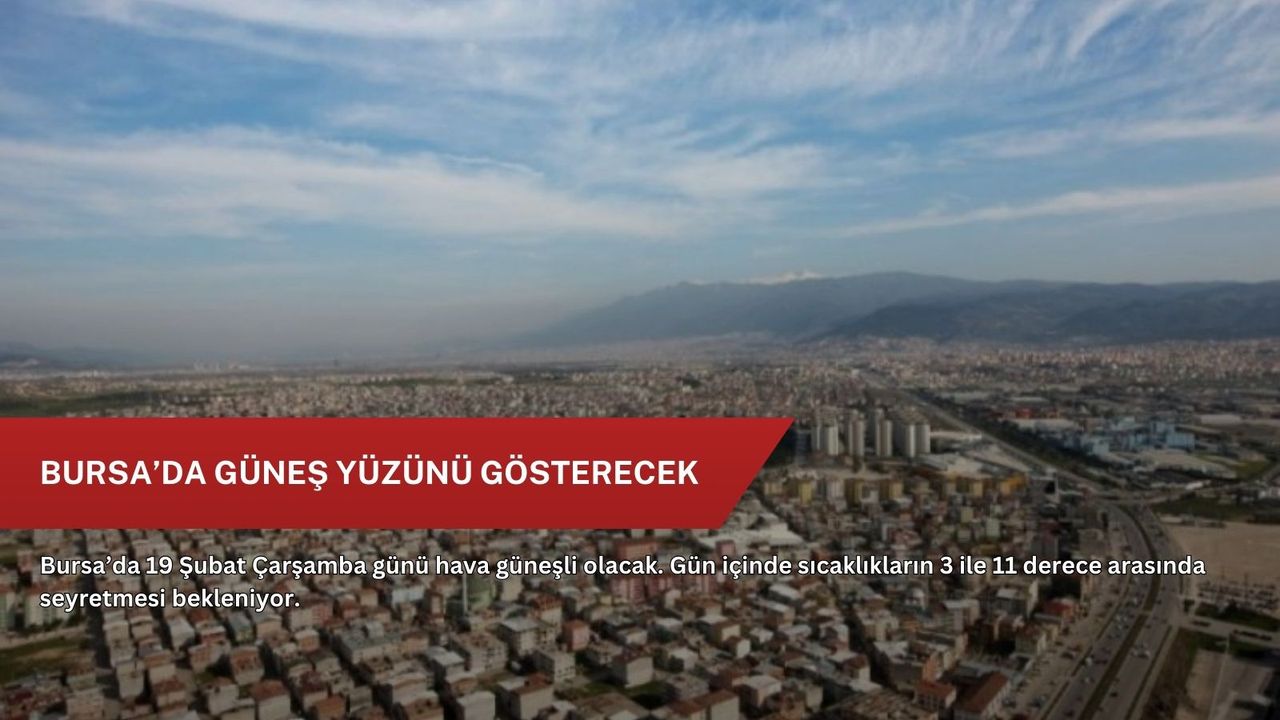 Bursa’da 19 Şubat Çarşamba günü güneşli bir hava etkili olacak. Meteorolojik verilere göre kent genelinde gün boyunca yağış beklenmezken, güneşli bir gökyüzü hâkim olacak.