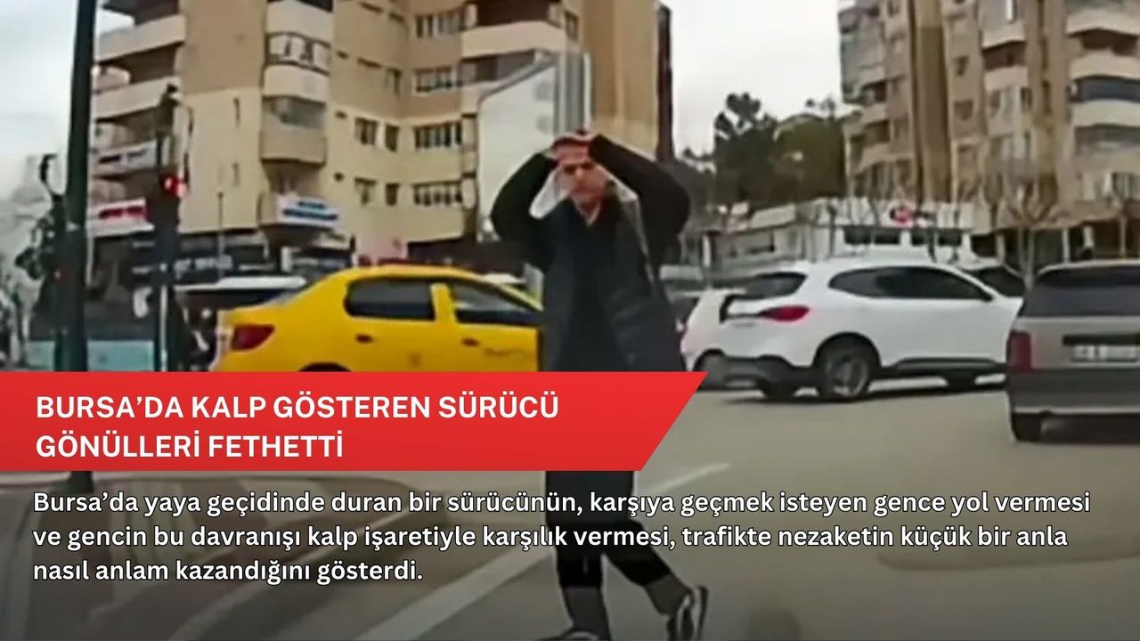 Bursa’nın Nilüfer ilçesinde yaya geçidinde yaşanan kısa ama dikkat çekici bir olay, araç kamerası tarafından kaydedildi. Bir sürücünün yol vermeden ilerlemesinin ardından, arkadan gelen başka bir araç durarak karşıya geçmek isteyen gence öncelik tanıdı. Genç ise bu davranışa kalp işaretiyle karşılık verdi.
