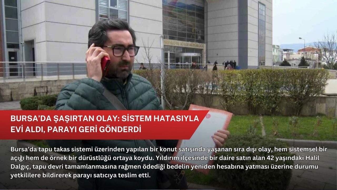 Edinilen bilgilere göre, Yıldırım ilçesi Namazgah Mahallesi’nde bulunan 2+1 daire için satıcıyla anlaşan Halil Dalgıç, ödeme işlemini e-Devlet üzerinden kullanılan tapu takas sistemi aracılığıyla gerçekleştirmek istedi. İlk etapta gönderilen tutarın aynı gün içinde iade edilmesi üzerine işlemin gerçekleşmediğini düşünen Dalgıç, ertesi gün Tapu ve Kadastro 4. Bölge Müdürlüğü’ne giderek tapu memurunun huzurunda konut bedelini yeniden sisteme aktardı.