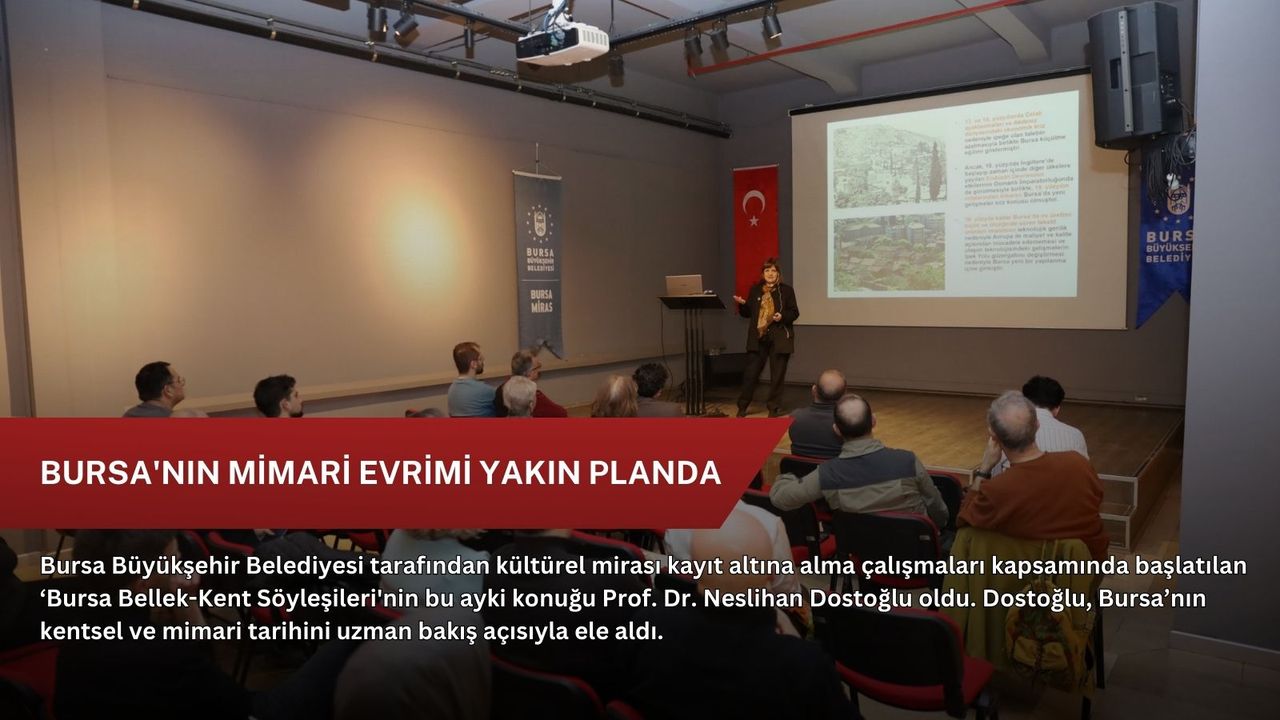 Bursa Büyükşehir Belediyesi Kent Tarihi ve Tanıtımı Dairesi Başkanlığına bağlı Kent Tarihi Araştırmaları ve Arşiv Şube Müdürlüğü tarafından başlatılan ‘Bursa Bellek-Kent Söyleşileri’ ile Bursa’da doğmuş, büyümüş veya hayatının bir kısmını Bursa’da geçirmiş sanatçı ve uzman kişiler kent belleğine ilişkin deneyim ve birikimlerini paylaşıyor. Büyükşehir Belediyesi tarafından 2026 yılının ‘700. Fetih Yılı’ ilan edilmesi ile etkinlikler bu bağlamda daha kapsamlı hale getirilirken, Prof. Dr. Neslihan Dostoğlu, Osmanlı şehirciliğinin temellerini atan Bursa’nın kentsel ve mimari tarihini, fetih sonrası gelişim sürecini, tarihi dokusunu ve mimari mirasını uzman bakış açısıyla değerlendirdi. Katılımcılar, Bursa’nın Irgandı Köprüsü, Koza Han, Pirinç Han gibi sembol yapılarının oluşturduğu mimari zenginliği ve kentleşme evrimini derinlemesine inceleme fırsatı buldu.
