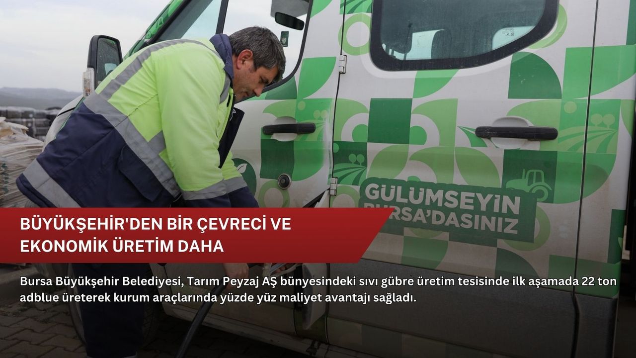 Bursa Büyükşehir Belediyesi, iklim değişikliğiyle mücadele, kaynakların verimli kullanımı ve maliyetlerin azaltılması hedefleri doğrultusunda Tarım Peyzaj AŞ bünyesindeki Sıvı Gübre Üretim Tesisi'nde AdBlue üretimine başladı. Ürünün tamamı belediyenin hizmet araçlarında kullanılarak maliyet oluşmasının önüne geçildi.