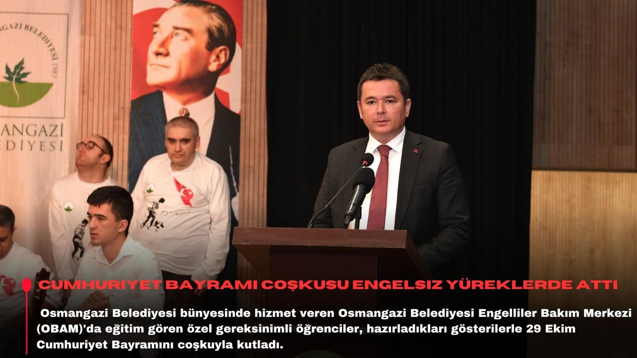 Türkiye Cumhuriyeti’nin 102’inci kuruluş yıldönümü için Osmangazi Belediyesi Engelli Bakım Merkezi (OBAM)'da eğitim gören özel gereksinimli öğrenciler, birbirinden özel gösteriler hazırladı. Osmangazi Gösteri Merkezinde düzenlenen kutlama etkinliğinde sahne alan özel öğrenciler, koro eşliğinde şarkılar söyleyip çeşitli gösteriler yaparak Cumhuriyetin 102’inci kuruluş yıldönümü büyük bir sevinç ve heyecanla kutladı. Engelli bireylerin yaptığı bir birinden özel gösteriler izleyenler tarafından büyük beğeni aldı. Düzenlenen kutlama etkinliğine Osmangazi Belediye Başkanı Erkan Aydın, belediye başkan yardımcıları, meclis üyeleri, öğrenciler ve vatandaşlar katıldı. Programa katılanlar engelli bireylerin söylediği coşkulu şarkılara alkışlarla ritim tutup eşlik ederek heyecanlarına ortak oldu.