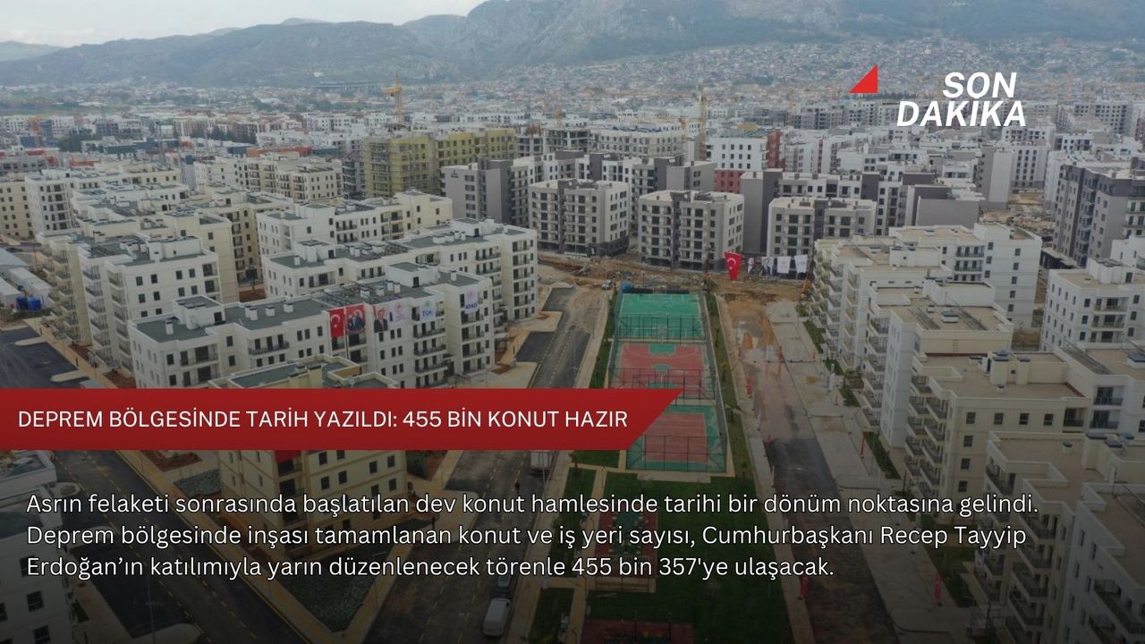 Asrın inşa seferberliğinin tamamlanacağı yarınki törenin ardından deprem bölgesinde inşa edilen ev ve iş yeri sayısı 455 bin 357’ye yükselecek. İllere göre dağılım ise şöyle olacak: Hatay’da 153 bin 755, Malatya’da 79 bin 660, Kahramanmaraş’ta 73 bin 956, Adıyaman’da 43 bin 366, Gaziantep’te 31 bin 53, Diyarbakır’da 17 bin 206, Elazığ’da 14 bin 894, Şanlıurfa’da 13 bin 429, Osmaniye’de 12 bin 557, Adana’da 12 bin 73, Kilis 2 bin 569, Tunceli’de 298, Kayseri’de 288, Sivas 164, Bingöl’de 89.