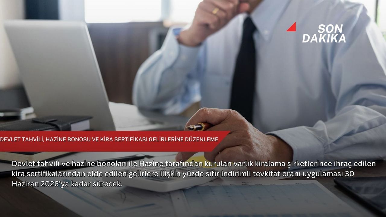 Buna göre devlet tahvili ve hazine bonoları ile Hazinece kurulan varlık kiralama şirketlerince ihraç edilen kira sertifikalarından elde edilen gelirler için yürürlükte olan indirimli tevkifat oranı (yüzde sıfır) uygulaması 30 Haziran 2026'ya kadar uzatıldı.