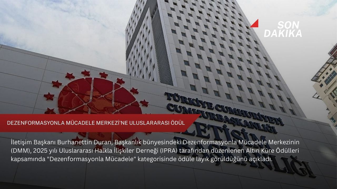 "Başkanlığımız bünyesinde faaliyetlerini sürdüren Dezenformasyonla Mücadele Merkezimiz, 2025 yılı Uluslararası Halkla İlişkiler Derneği (IPRA) tarafından düzenlenen Altın Küre Ödülleri kapsamında 'Dezenformasyonla Mücadele' kategorisinde ödüle layık görüldü. Bu anlamlı başarıda emeği geçen tüm mesai arkadaşlarıma teşekkür ediyorum.