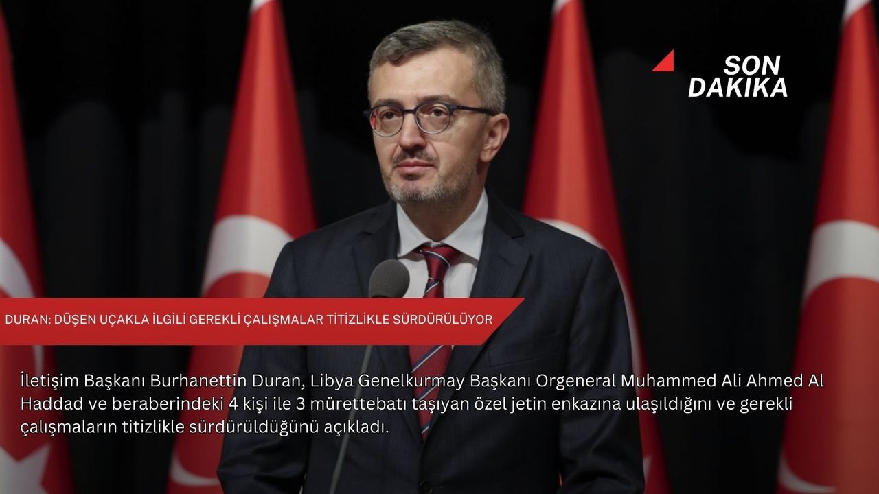 "23 Aralık 2025 günü Libya Genelkurmay Başkanı Orgeneral Muhammed Ali Ahmed Al Haddad ve maiyetindeki 4 kişi ile 3 mürettebatı taşıyan bir özel jet, 20.17'de Esenboğa Havalimanı'ndan kalktıktan sonra 20.33'te hava kontrol merkezine elektrik arızasından kaynaklı acil durum bildirmiş ve acil iniş talebinde bulunmuştur." bilgisini paylaşan Duran, şunları kaydetti:
