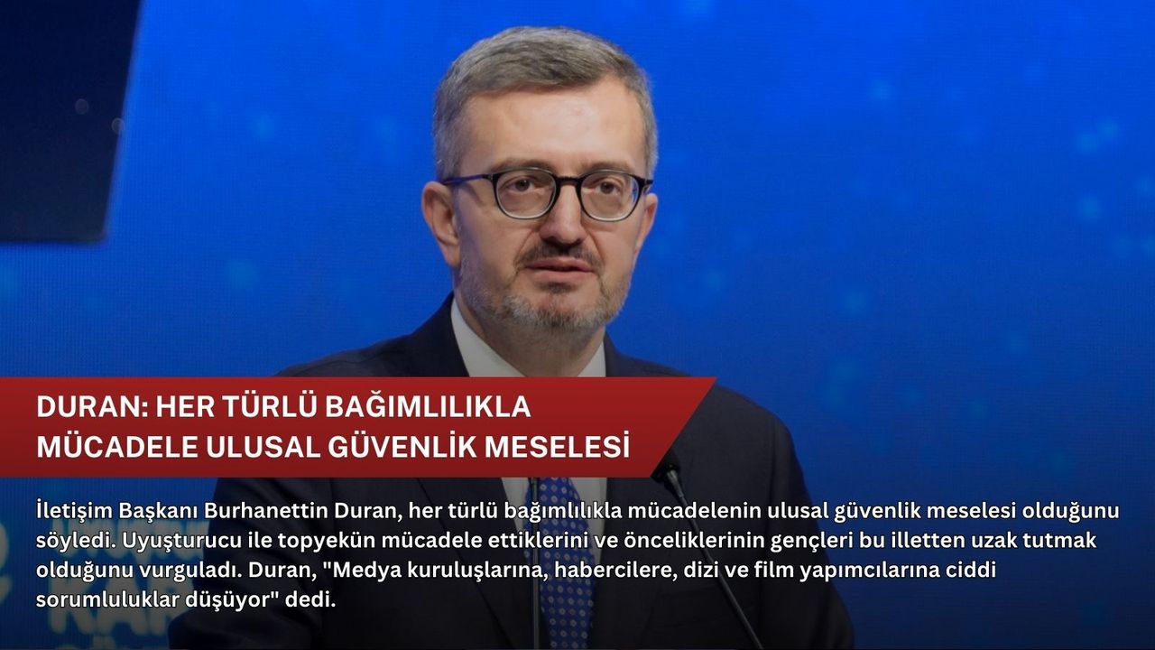 İletişim Başkanı Burhanettin Duran, İletişim Başkanlığınca düzenlenen "Uyuşturucuyla Mücadelede Kararlı Devlet Güvenli Türkiye Paneli"nde yaptığı konuşmada, her türlü bağımlılıkla mücadelenin, Cumhurbaşkanı Recep Tayyip Erdoğan'ın liderliğinde gelecek on yıllara bakan Türkiye'nin en önemli konularından biri olduğunu söyledi.