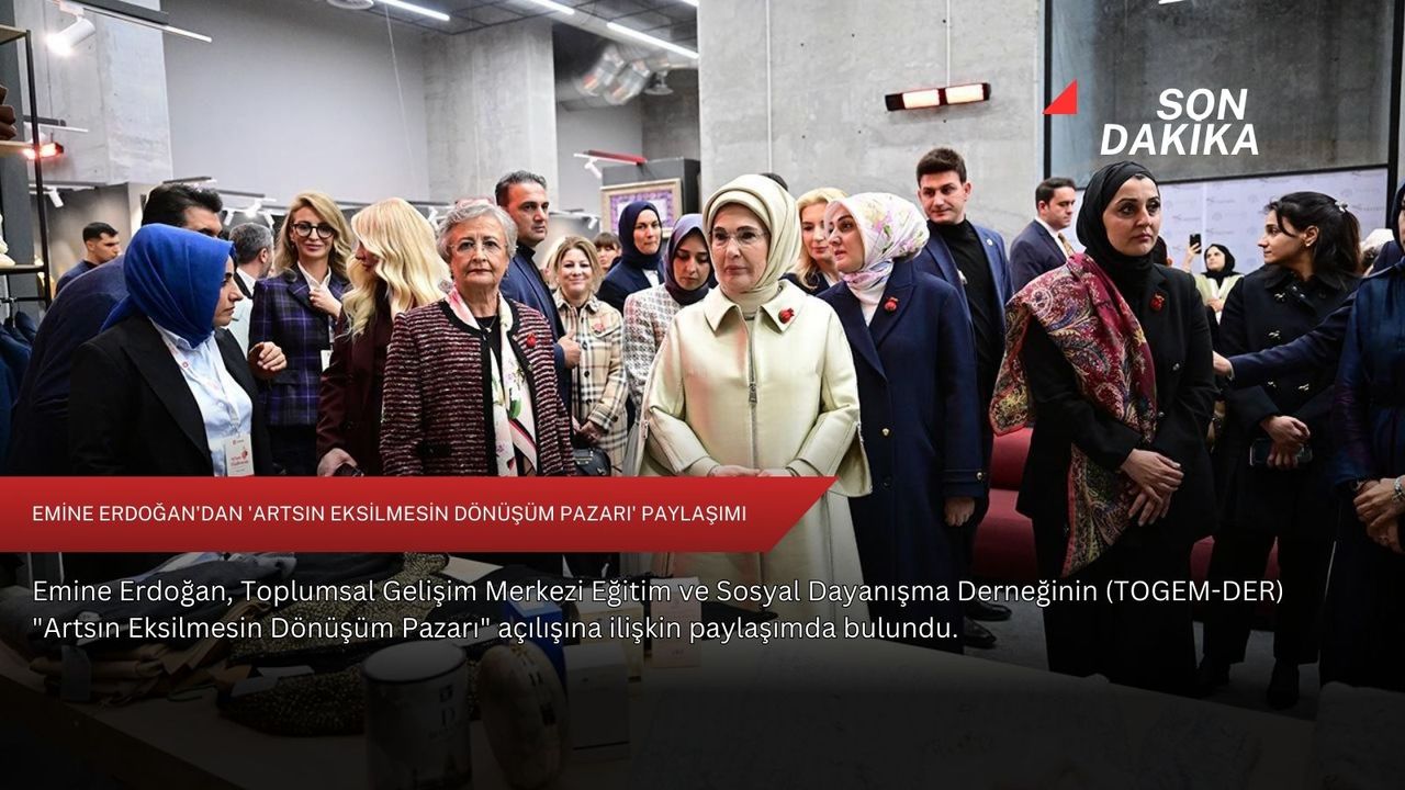 Cumhurbaşkanı Recep Tayyip Erdoğan'ın eşi Emine Erdoğan, NSosyal hesabından yaptığı paylaşımda, "TOGEM-DER Artsın Eksilmesin Dönüşüm Pazarı ile paylaşılan her iyiliğin kök salmasını diliyorum. Merhametin çoğaldığı yarınlar temenni ediyorum." ifadesini kullandı.