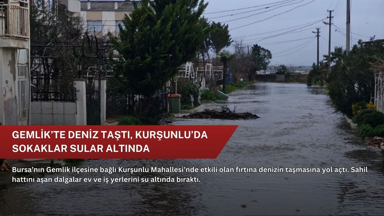 Bursa’nın Gemlik ilçesine bağlı Kurşunlu Mahallesi’nde etkili olan şiddetli fırtına hayatı olumsuz etkiledi. Kuvvetli rüzgar ve yüksek dalgalar nedeniyle deniz taşarken, sahil hattını aşan su mahalle içlerine kadar ilerledi.