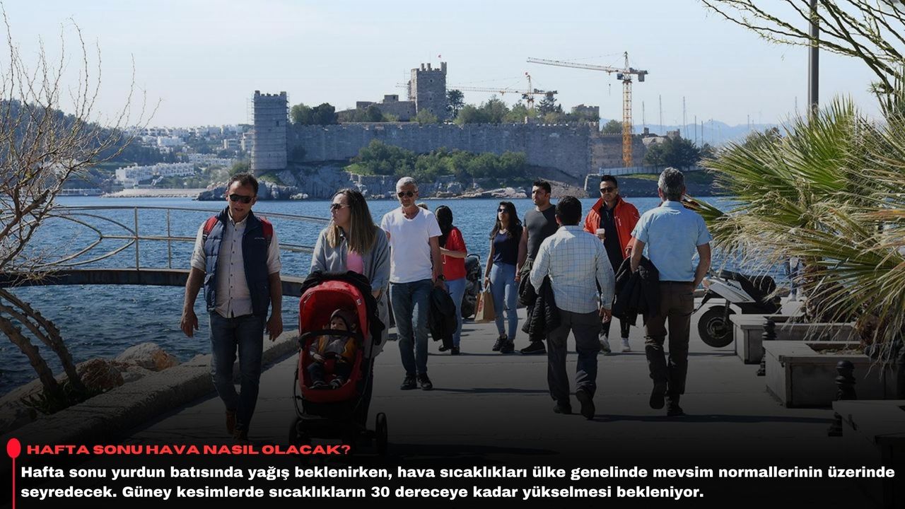 Hafta sonu beklenen günün en yüksek sıcaklık değerleri Ankara'da 21, İstanbul'da 20, Samsun'da 26, İzmir'de 24, Antalya'da 27, Adana'da 30, Diyarbakır'da 19, Erzurum'da 10 derece civarında seyredecek.