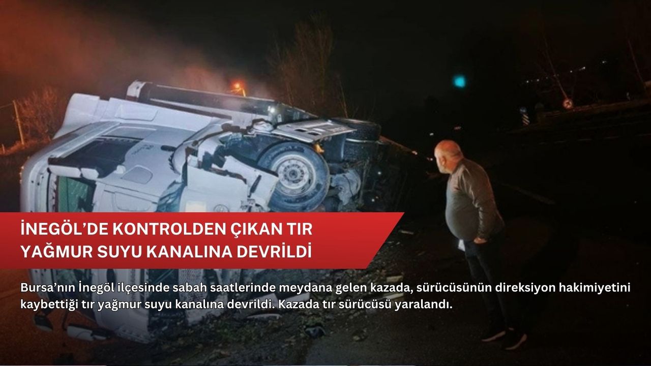 Devrilen tırın yağmur suyu kanalına düşmesi sonucu sürücü araç içinde sıkışarak yaralandı. Olayı görenlerin ihbarı üzerine bölgeye sağlık ve jandarma ekipleri sevk edildi. Yaralı sürücüye olay yerinde ilk müdahale yapılırken, ardından ambulansla İnegöl Devlet Hastanesi’ne kaldırıldı.