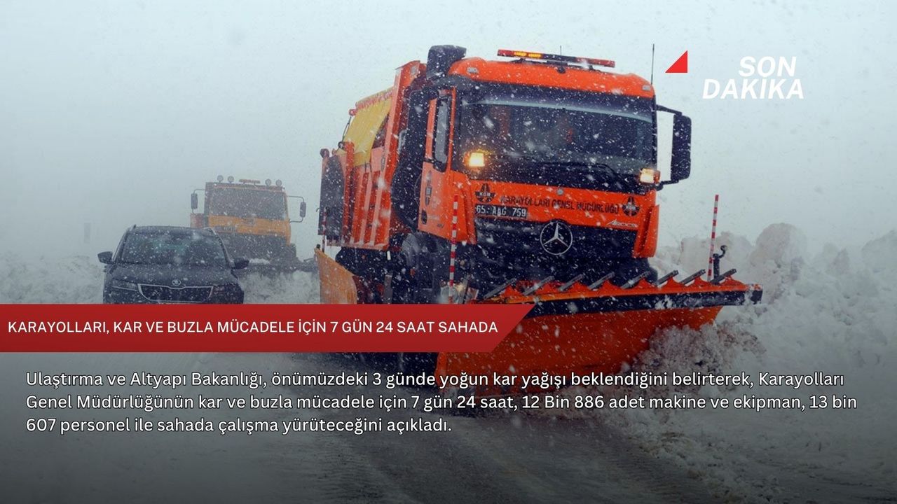 Açıklamada, Karayolları Genel Müdürlüğünün vatandaşların güvenli ulaşımını sağlamak amacıyla, kar ve buzla mücadele için 7 gün 24 saat esasına göre sahada olacağı belirtilerek, "Bu çalışmalarımız yurt genelinde 68.519 km’lik yol ağında, 457 Karla Mücadele Merkezi üzerinden, 12 Bin 886 adet makine ve ekipman, 13 bin 607 personel tarafından yürütülmektedir. Çalışmalarımızda kullanılmak üzere 757 bin ton tuz, 453 bin m3 tuz agregası ve kritik kesimler için 12 bin ton tuz çözeltisi karla mücadele merkezlerinde depolanmıştır. Yollarımızda tipi ve esinti nedeni ile trafik akışının güçleştiği ve kapandığı kesimlere 930 km kar siperi yapılmıştır." ifadelerine yer verildi.