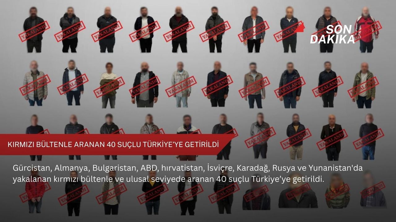 İçişleri Bakanı Ali Yerlikaya, sosyal medyadan yaptığı açıklamada, Gürcistan, Almanya, Bulgaristan, ABD, hırvatistan, İsviçre, Karadağ, Rusya ve Yunanistan'da yakalanan kırmızı bültenle ve ulusal seviyede aranan 40 şüphelinin izinin titizlikle sürüldüğünü belirtti.