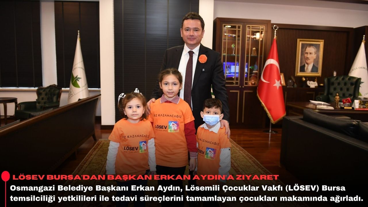 LÖSEV’in öncülüğünde 2-8 Kasım tarihleri arasında düzenlenen Lösemili Çocuklar Haftası kapsamında Lösemili Çocuklar Vakfı (LÖSEV) Bursa İl Koordinatörü Aslı Metin Sakarya, LÖSEV Bursa Halkla İlişkiler Koordinatörü Meral Aydın Yıldırım, LÖSEV Bursa Sosyal Hizmetler Sorumlusu Fettah Ay, LÖSEV Bursa İl Koordinatörü Asistanı Serhat Güneş ve tedavi süreçlerini tamamlayan çocuklar, Osmangazi Belediye Başkanı Erkan Aydın’ı makamında ziyaret etti.