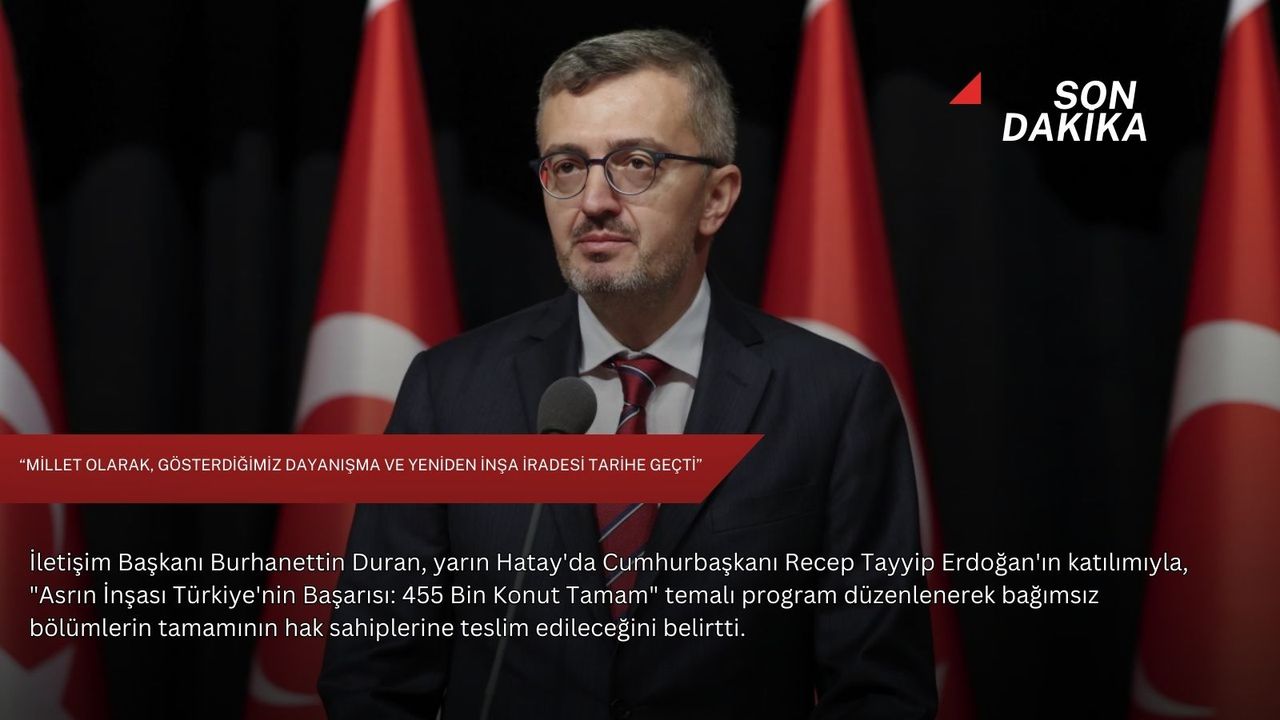 İletişim Başkanı Burhanettin Duran, NSosyal hesabından yaptığı paylaşımda, "asrın felaketinin" ardından devlet ve milletin el ele vererek yaraları sarmak için tarihi bir mücadele ortaya koyduğunu ifade etti.