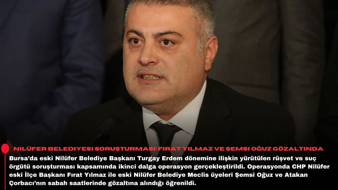 Soruşturma kapsamında bu sabah Nilüfer ilçesinde ikinci dalga operasyon gerçekleştirildi. Operasyonda CHP Nilüfer eski ilçe başkanı Fırat Yılmaz ile eski Nilüfer Belediye Meclis üyeleri Şemsi Oğuz ve Atakan Çorbacı gözaltına alındı.