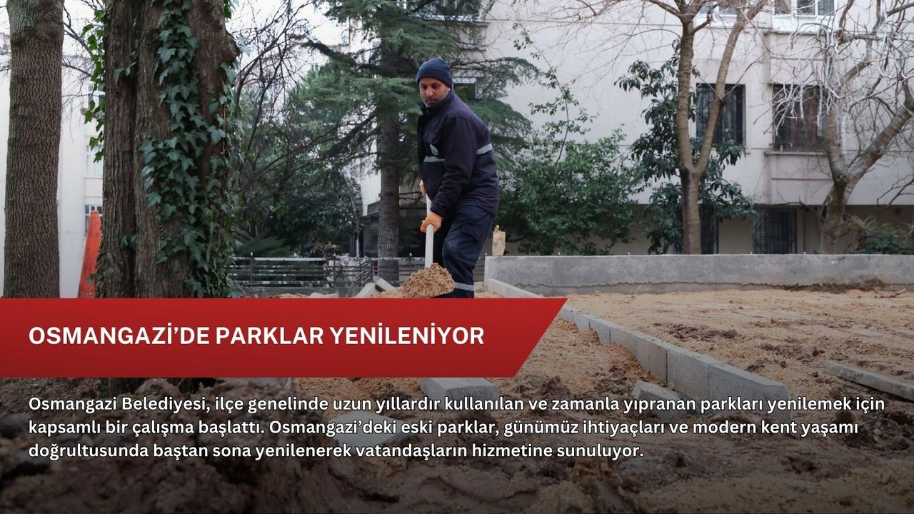 Yaptığı çalışmalarla ilçeyi yeni parklarla donatan Osmangazi Belediyesi, zamanla yıpranan parkları da elden geçirerek yeşil alan çalışmalarını aralıksız sürdürüyor. Dikkaldırım Mahallesi’nde 26 yıl önce yapılan ve kullanım nedeniyle eskiyen Buket Parkı için harekete geçen Osmangazi Belediyesi Park ve Bahçeler Müdürlüğü ekipleri, çalışmalarını hızla sürdürüyor.
