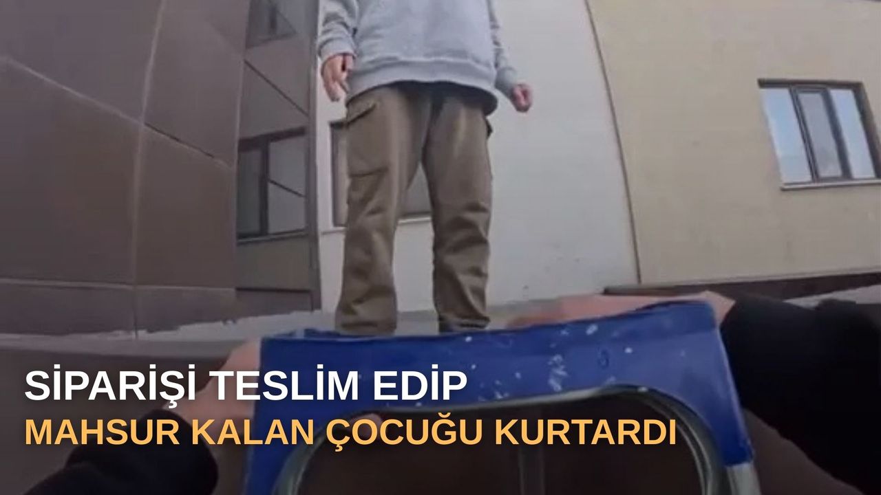 O sırada binaya sipariş götüren bir kurye, durumu fark eden çocukların yardım çağrısı üzerine harekete geçti. Önce siparişini güvenle teslim eden kurye, ardından eline merdiveni alarak çocuğu mahsur kaldığı yerden indirdi.