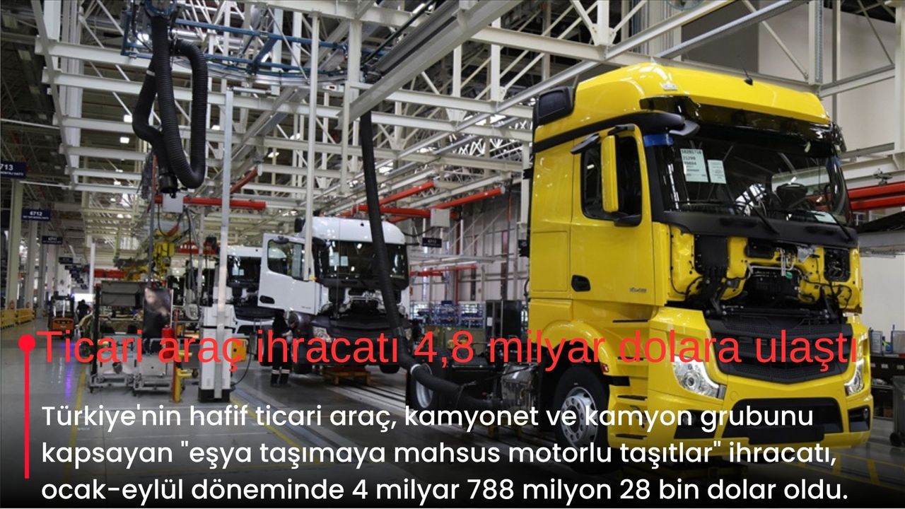 Bu rakamın yüzde 15,8'ini oluşturan "eşya taşımaya mahsus motorlu taşıtlar" ihracatı ocak-eylül döneminde, geçen yılın aynı dönemine göre yüzde 14 artışla 4 milyar 197 milyon 886 bin dolardan 4 milyar 788 milyon 28 bin dolara çıktı.