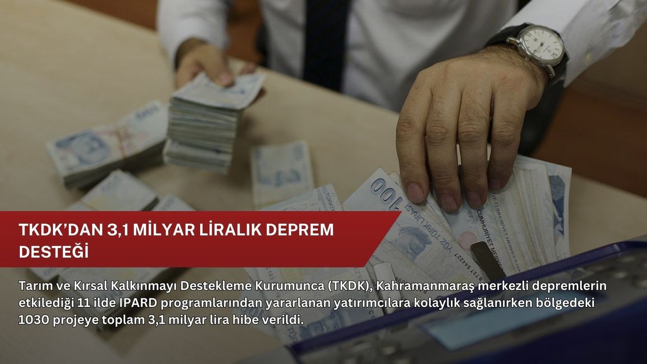 Depremlerden etkilenen Kahramanmaraş, Hatay, Osmaniye, Adıyaman, Diyarbakır, Şanlıurfa, Gaziantep, Kilis, Adana, Malatya ve Elazığ'da bugüne kadar 1030 projeye toplam 3,1 milyar lira hibe sağlandı.
