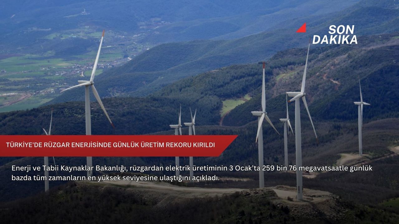 Enerji ve Tabii Kaynaklar Bakanlığı'ndan yapılan açıklamada, yenilenebilir enerji alanında kırılan rekorlara 2026’nın ilk günlerinde bir yenisinin eklendiği belirtildi. Bu kapsamda, rüzgardan elektrik üretiminin 3 Ocak’ta 259 bin 76 megavatsaatle bugüne kadarki en yüksek günlük üretim seviyesine ulaştığı kaydedildi.