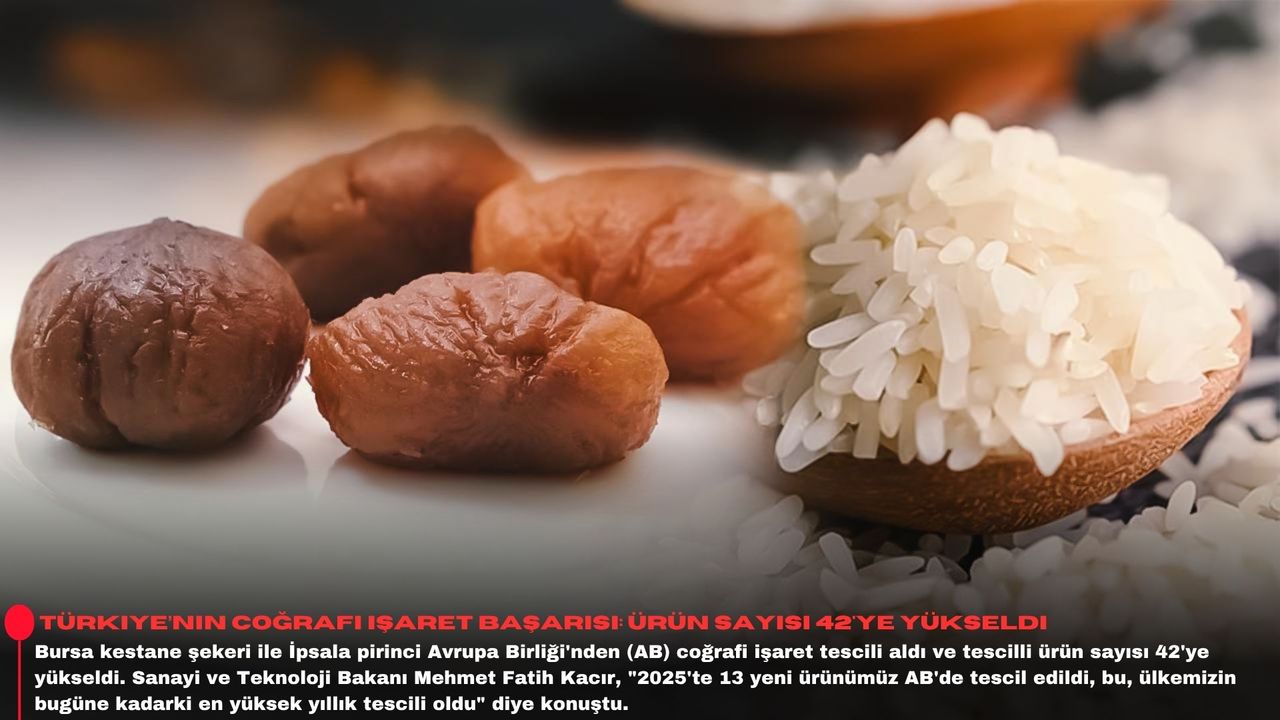 Uluslararası coğrafi işaret seferberliğiyle Anadolu'nun değerlerini dünya çapında tanıtmaya devam ettiklerini belirten Kacır, "İpsala pirinci ve Bursa kestane şekeriyle, AB'de tescil edilen coğrafi işaretli ürünlerimizin sayısı 42 oldu. Edirne'nin verimli İpsala Ovası'nda yetişen pirincimiz ve Bursa'nın ustalık geleneğini yaşatan kestane şekerimiz, yerelden küresele uzanan bir markalaşma hikayesinin simgeleri. 2025'te 13 yeni ürünümüz AB'de tescil edildi, bu, ülkemizin bugüne kadarki en yüksek yıllık tescili oldu" değerlendirmesinde bulundu.