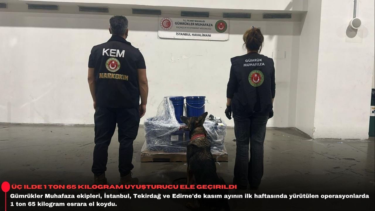 Bu kapsamda kasımın ilk haftasında yürütülen operasyonlarda İstanbul Havalimanı'nda 216,6 kilogram, Edirne'deki İpsala Gümrük Kapısı'nda 234,2 kilogram ve Tekirdağ Limanı'nda 614,68 kilogram olmak üzere 1 ton 65 kilogram esrar ele geçirildi.