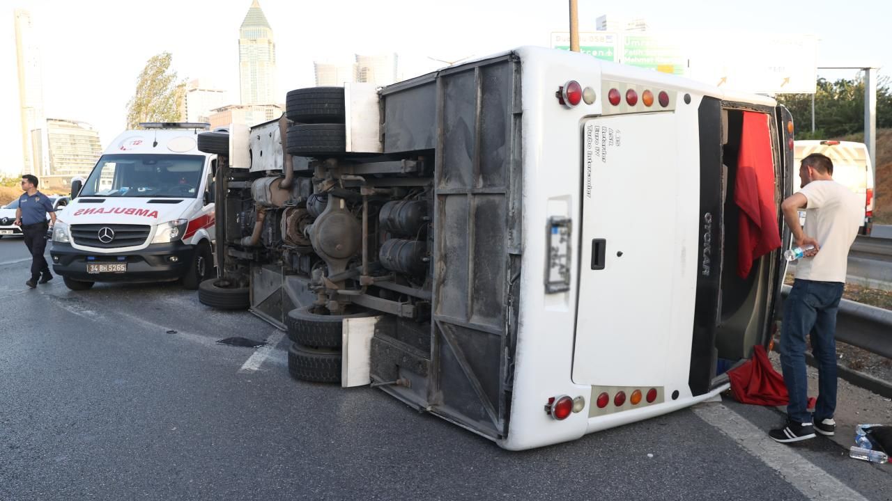 Ümraniye Çamlıca Anadolu Kavşağı'nda seyir halinde olan ve banka çalışanlarını taşıyan servis aracı devrilerek yan yattı.