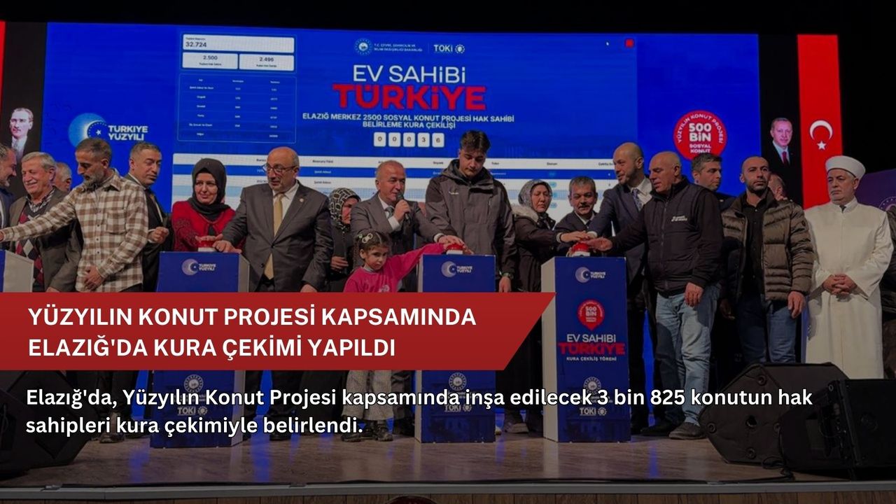 "Cumhurbaşkanımızın müjdesini verdiği 500 bin sosyal konut kampanyasıyla Elazığ'a yeni konutlar kazandıracağız. Bu proje devletimizin bugüne kadar ortaya koyduğu en kapsamlı sosyal konut hamlesi olup yaklaşık 2 milyon vatandaşımıza yuva olacaktır. Bu kapsamda şimdiye kadar 41 ilimizde kurallar çekilmiş ve 143 bin 658 hak sahibi belirlenmiştir. Elazığ merkez ilçe başta olmak üzere Ağın, Alacakaya, Arıcak, Baskil, Karakoçan, Keban, Kovancılar, Palu, Sivrice ve Maden ilçelerimizden kampanyaya 48 bin 122 vatandaşımız başvuruda bulunmuştur. Biraz sonra noter ve sizlerin huzurunda bu talepler içinden 3 bin 825 ailemiz belirlenecektir."