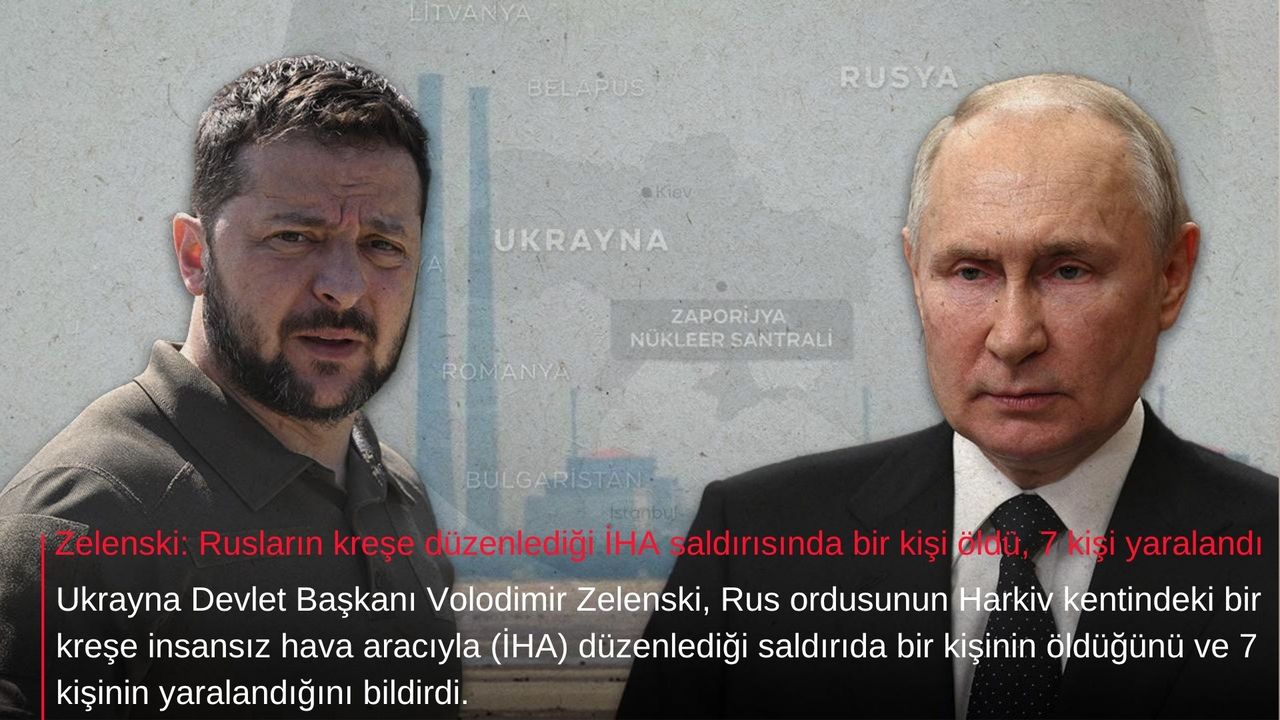 Zelenski, Telegram hesabından yaptığı yazılı açıklamada, Rusların Harkiv'de bir kreşe İHA ile saldırdığını belirterek, "Rusların Harkiv'de kreşe düzenlediği İHA saldırısında bir kişi öldü, 7 kişi yaralandı. Binadaki tüm çocuklar tahliye edilerek sığınağa götürüldü." ifadelerini kullandı.